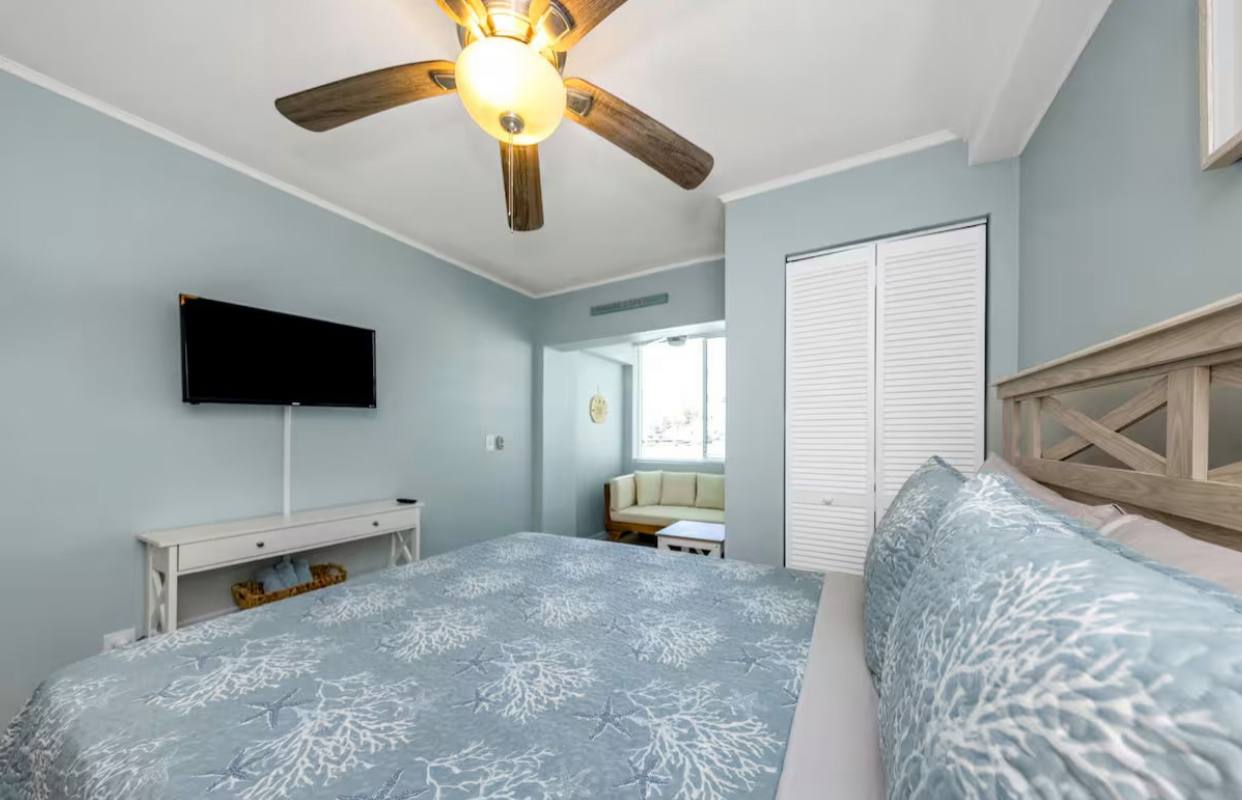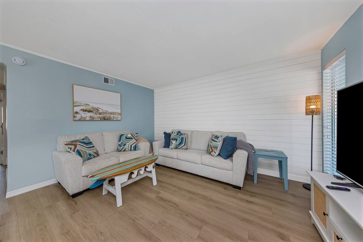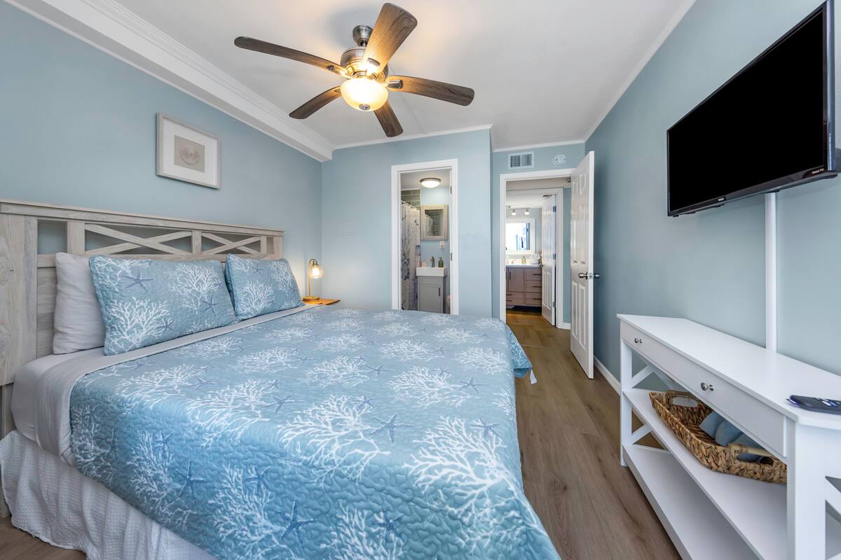 Two Comfortable Bedrooms: The master suite boasts a plush king-size bed, private en-suite bathroom, and direct access to ocean vistas. The second bedroom offers two cozy twin beds or a queen bed, perfect for guests or children, with easy access to the second full bathroom.